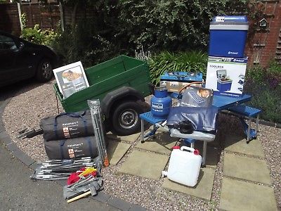 camping equipment – kalahari 10 man tent – trailer and accessories items listed – kalahari 10 man outer tentkalahari 10 man inner tentkalahari 10 man tent poles2 x sets of pegs and malletskango steel king poles for tent door openersavana gas cookergas bottle and regulatorhi – gear kitchen stand dlxfold out table and chairs2 x hi – gear single air beds1 x adventuridge double flock air bed1 x electric air bed pump1 x 10 litre water containeroutwell 24 litre / 230v electric coolboxand to put it all in -trailer – 1.2 metres x 1.0 metre x 0.5 metre c/w electrics – 2 new tyresthese items have been used –  maybe 5 times but are in great condition – all you need are sleeping bags and your good to go – grab a bargain – from a smoke and pet free home – paypal or cash on collection only thanks for looking