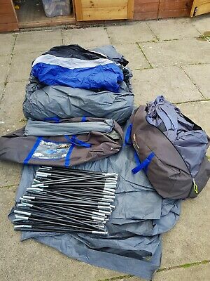 Hi Gear Kalahari 10 man tent with additional footprint groundsheet. Great Condition as only used 5 times and stored in a dry attic. Collection in person only please.Note picture of tent erected is not this actual tent but is the same colour and model. Tent has 2 separate sleeping compartments at each end, and you can choose not erect one of them if you are a smaller group wanting even more living space.Features include:- 3000mm hydrostatic head- Reinforced and welded integral groundsheet along with a separate additional groundsheet footprint- Water repellent zips- Electric hookup cable access point- Hanging storage pockets- Multiple ventilation options- 2 door entrance, with door poles to make porch- Living area clear windows – Bright guylines for extra visibility- Pole bracing system for added stability Comes complete in 2 transport bags with carry handles.Please contact me if you want any more info and happy bidding !