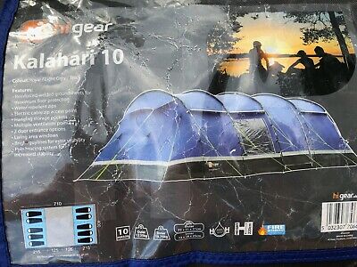 Hi-Gear Kalahari 10 Man Tent with Porch (No Reserve)Used for two family holidays then decided to downsize as this is a very large tent (see dimensions in pictures).Two separate inner tent attachments with up to 4 bedroom compartments.Does not include carpet or footprint/groundsheet. These are affordable from new from Go Outdoors.In excellent condition.Only damage is a minor tear in one of the outside flaps, but this does not affect the integrity of the tent.Will likely need new tent pegs.(Unfortunately I don’t have an actual picture of the tent when erected but there are lots of examples online).Collection only from Worcester, M5 Junction 6.Description from Go Outdoors:
