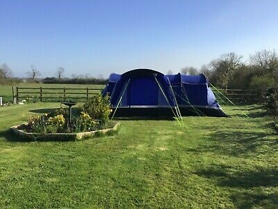 Hi-gear tent 10 man kalahari. Blue. 11 years old. Good condition. Buyer will collect because of the weight. Comes with add on porch. Only used three times many years ago . Been in storage for 8 years.Has a spare sheet for putting underneath the tent. One pole has been taped up but still works. There is a spare pole. Airing it out this weekend. Bit of corrosion on the zips and rings but overall very nice condition and easy to erect in half an hour.