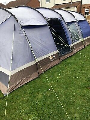 HiGear Kalahari10 tent in blue. Condition is Used.Waterproofed annuallyComes with built in ground sheet, footprint ground sheet, bedroom inners x 2 luxury carpet, matching porchAdditional items 2 x double air beds, 2 x single camp beds, picnic table, electric pump, gas stove, kettle, pans etcSlight damage to one side. But still usable. Hence price.Cash on collection.