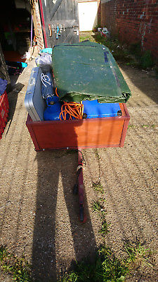 Trailer with electrics, Hi Gear kalahari 10 with extra groundsheet, Tent carpets x2,Electrics, Camping table Cook station Cooker cutlery and plastic crockery several gas bottles. All used but good condition Table has a wear spot on it but does not affect use.Tent is Fully waterproof and tested used 3 times. Will not separate collection only.Cash on collection