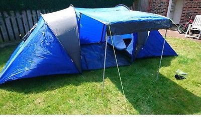 6 person tunnel tent. 2 rooms, 2 doors, mosquito nets and separate groundsheet. Fiberglass poles that are colour coded. Tent material polyester. Hydrostatic head 1500mm – the higher the figure, the more waterproof the tent. Fire retardant double skin with taped seams. Living space size H150, W150, L230cm. Maximum height 150cm. Pitched size H140, W230, L530cm. Packed size L56, W23, . Packed weight 7.8kg.This tent has only been used twice and is in a great condition, there is just one small mud stain on one of the bedroom doors, but otherwise in a perfect condition.