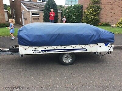 Conway Conquest Trailer Tent . Condition is Used. Collection in person only.In good condition, slight tears as shown in pics but no leaks or damp.Comes with ground sheets,table, curtains,water butts,step,jack wheel and pegs and mallet.Slept a family of 5 comfortably.Oven in good working order, cover on oven needs the hinge tightening up and oiling but easy job.Good to tow and wheels all in good condition.
